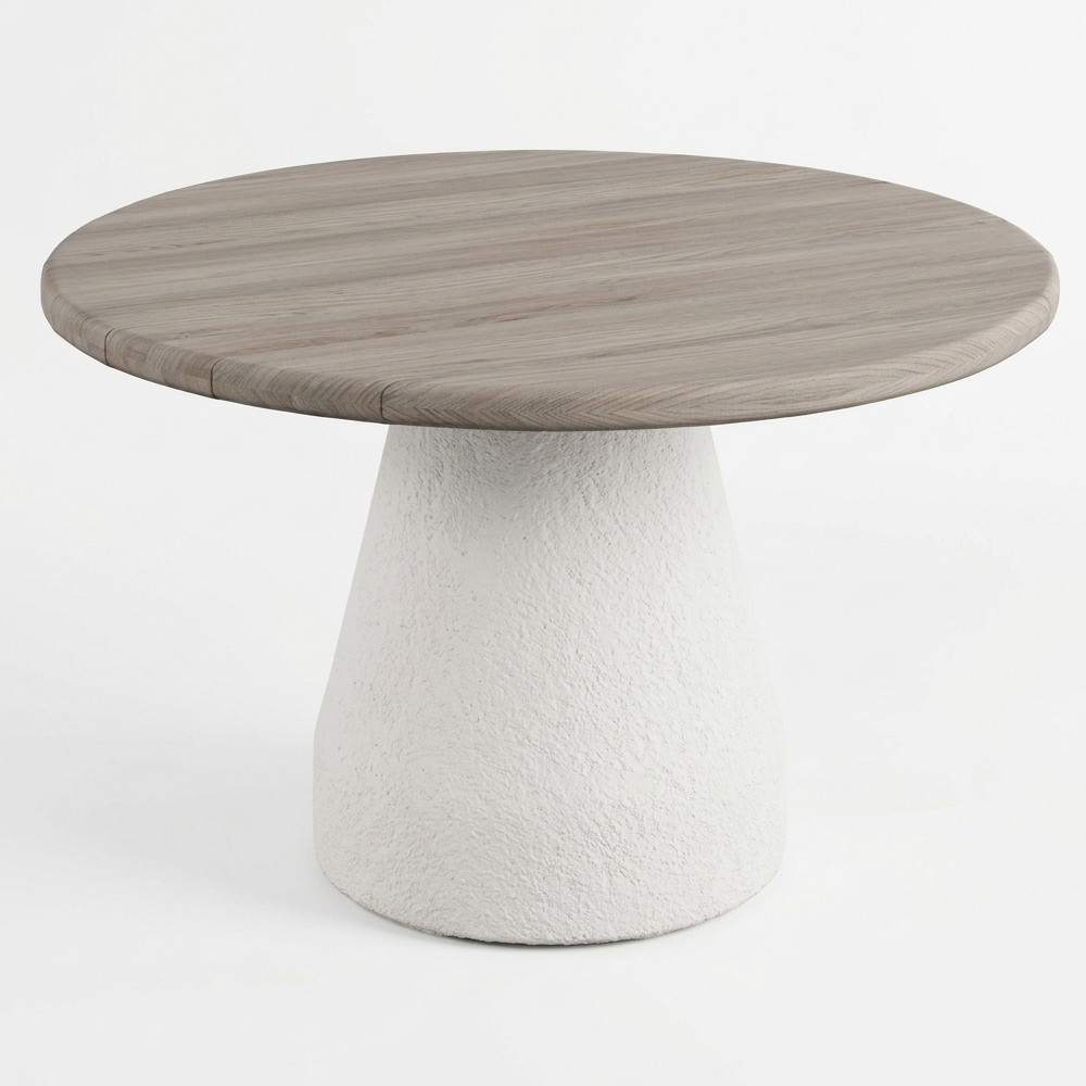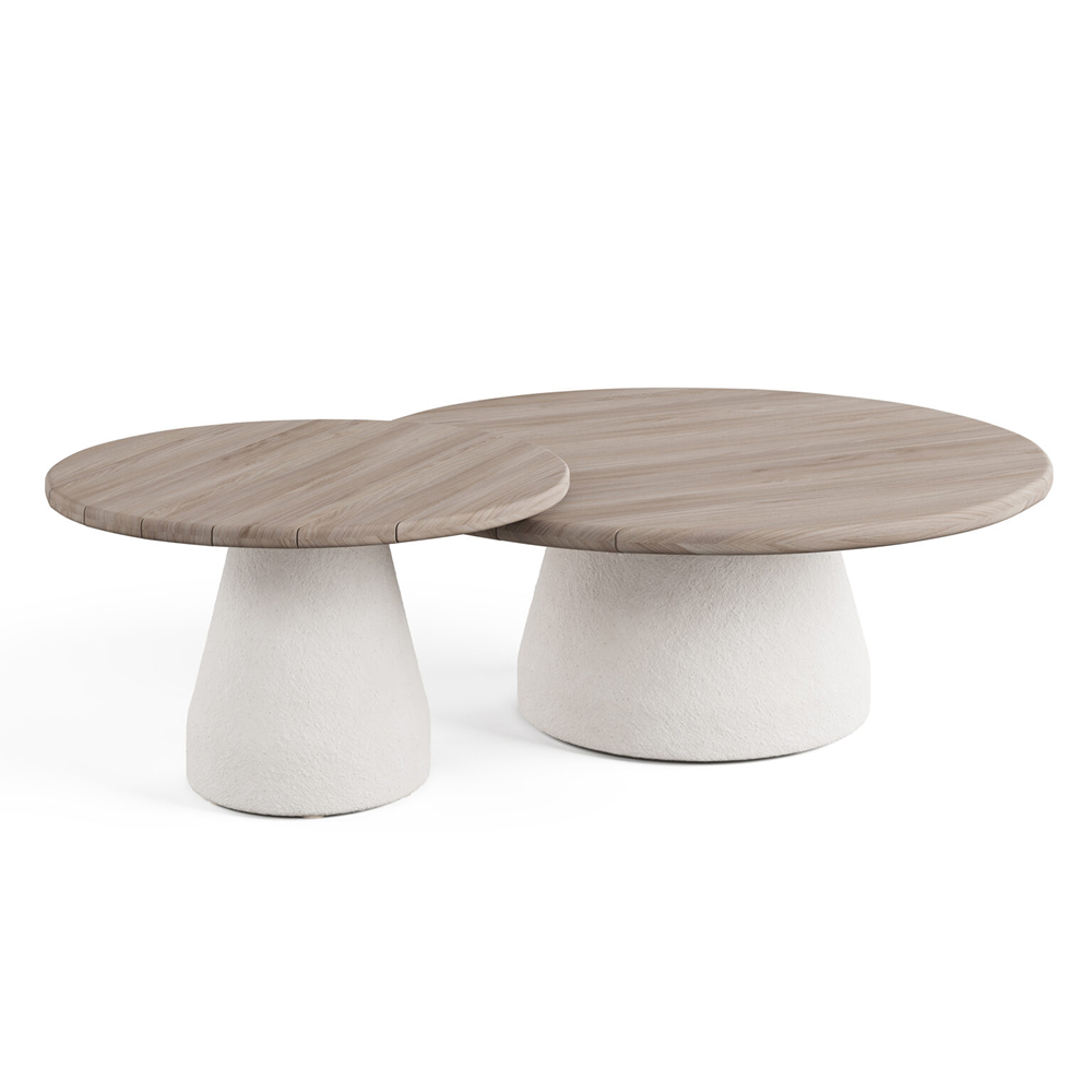 Su tapa en madera de teca natural destaca por la belleza de su veta única, aportando un toque de elegancia rústica, mientras que la base en fibra de vidrio con acabado mate en color beige asegura estabilidad y resistencia con un estilo moderno.