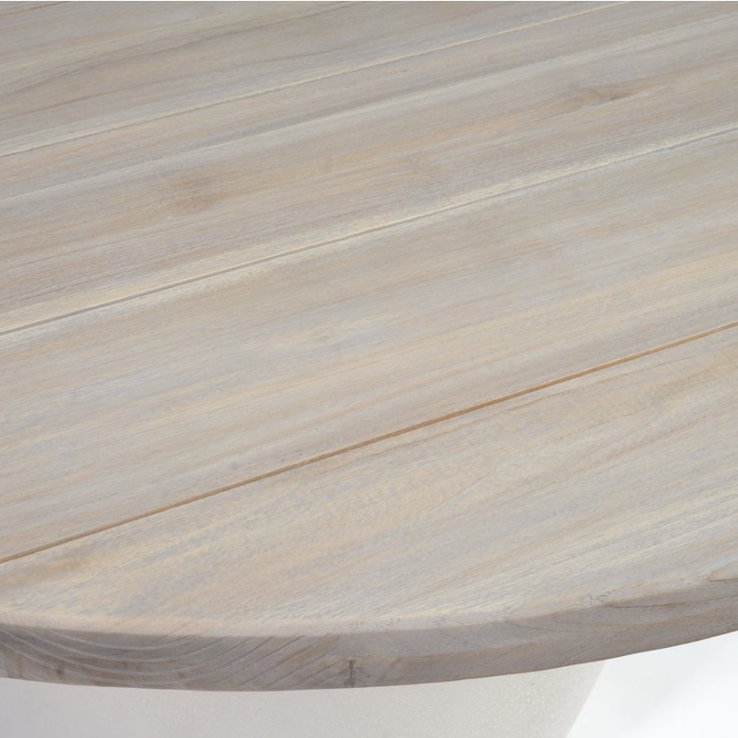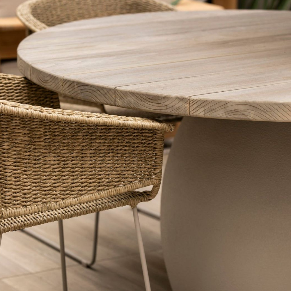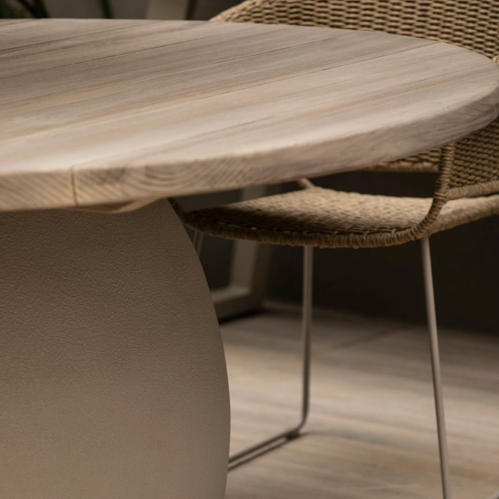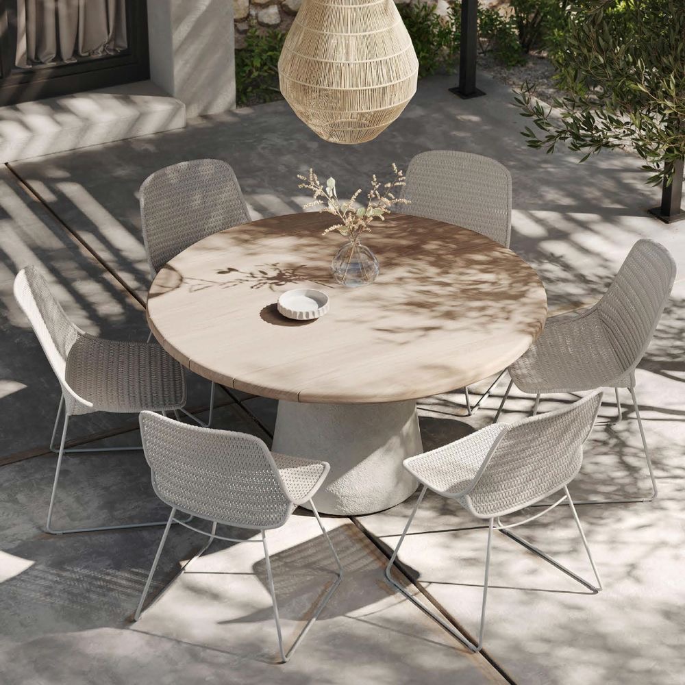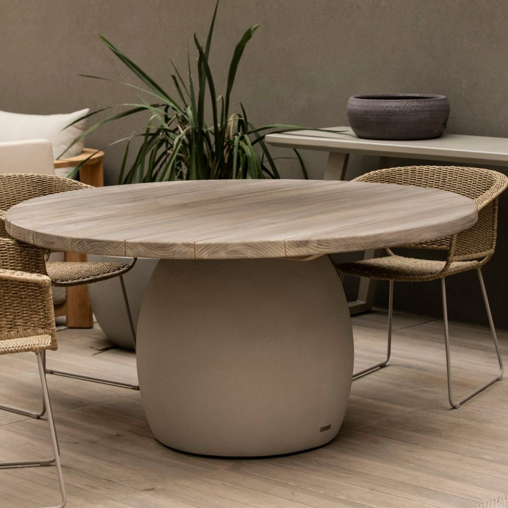 Su base en fibra de vidrio ofrece una estructura robusta y resistente, con un acabado moderno que contrasta armoniosamente con la tapa de madera de teca natural, conocida por su belleza y durabilidad. La veta única de la teca aporta calidez y un toque artesanal, haciendo de esta mesa el centro de atención en cualquier comedor. Ideal para cenas familiares o encuentros con amigos, la AMOS proporciona un ambiente acogedor y elegante, perfecto para disfrutar de momentos inolvidables en un entorno atemporal.